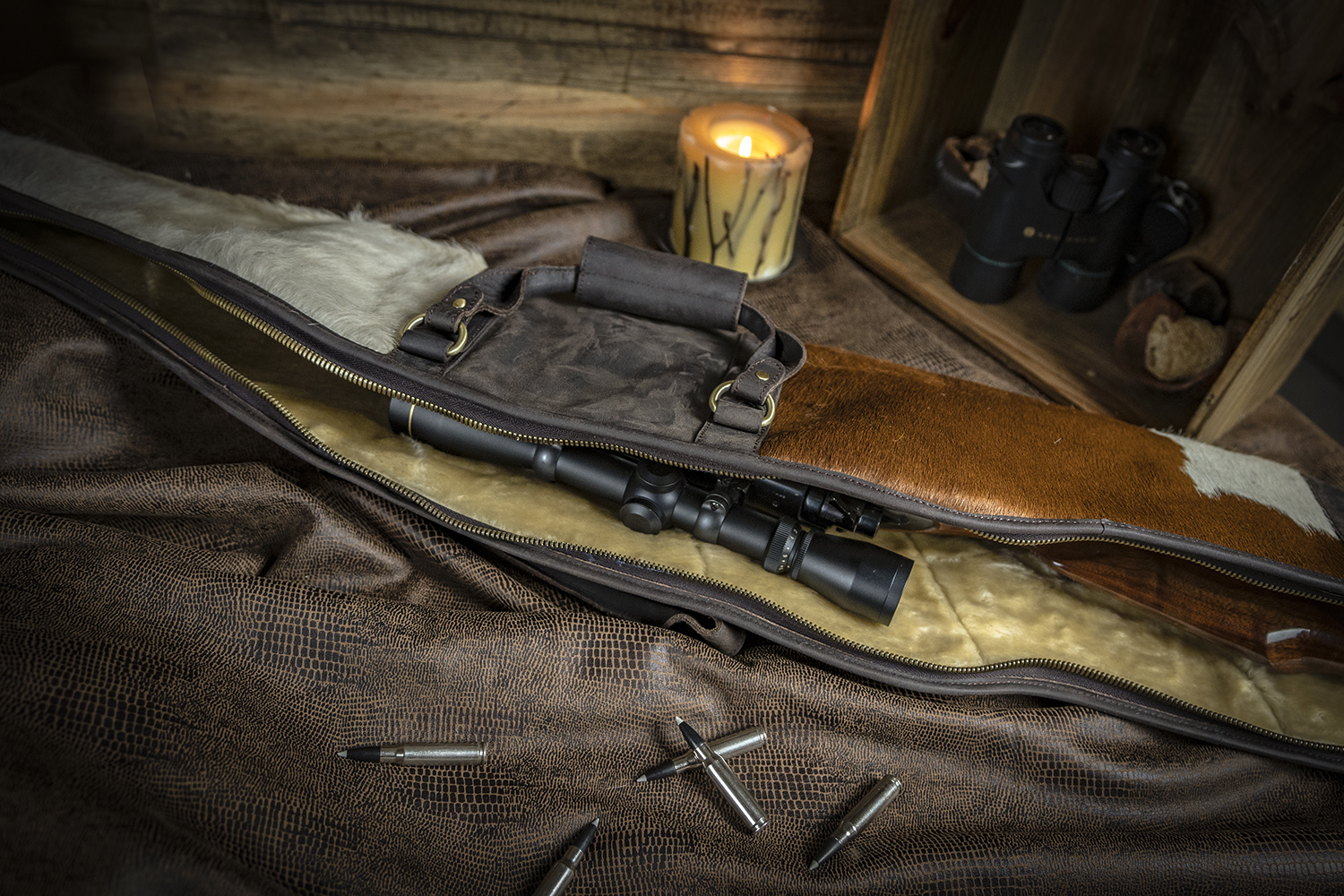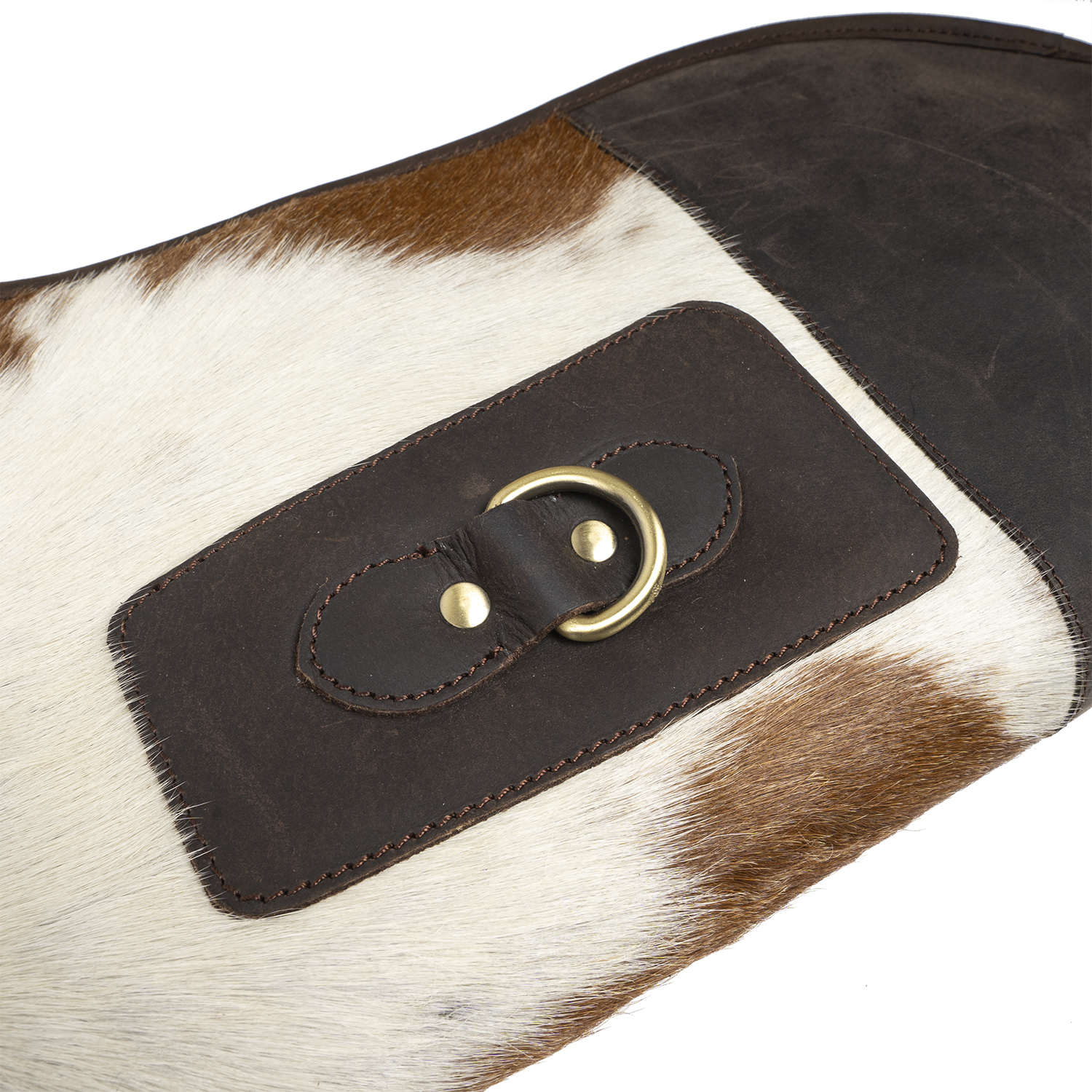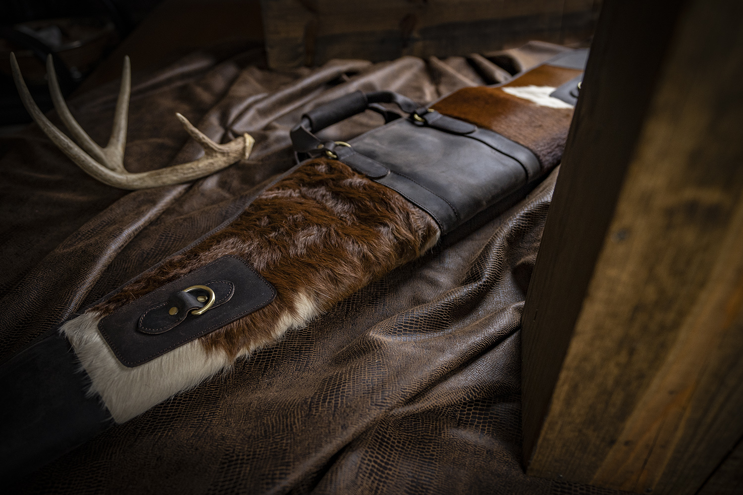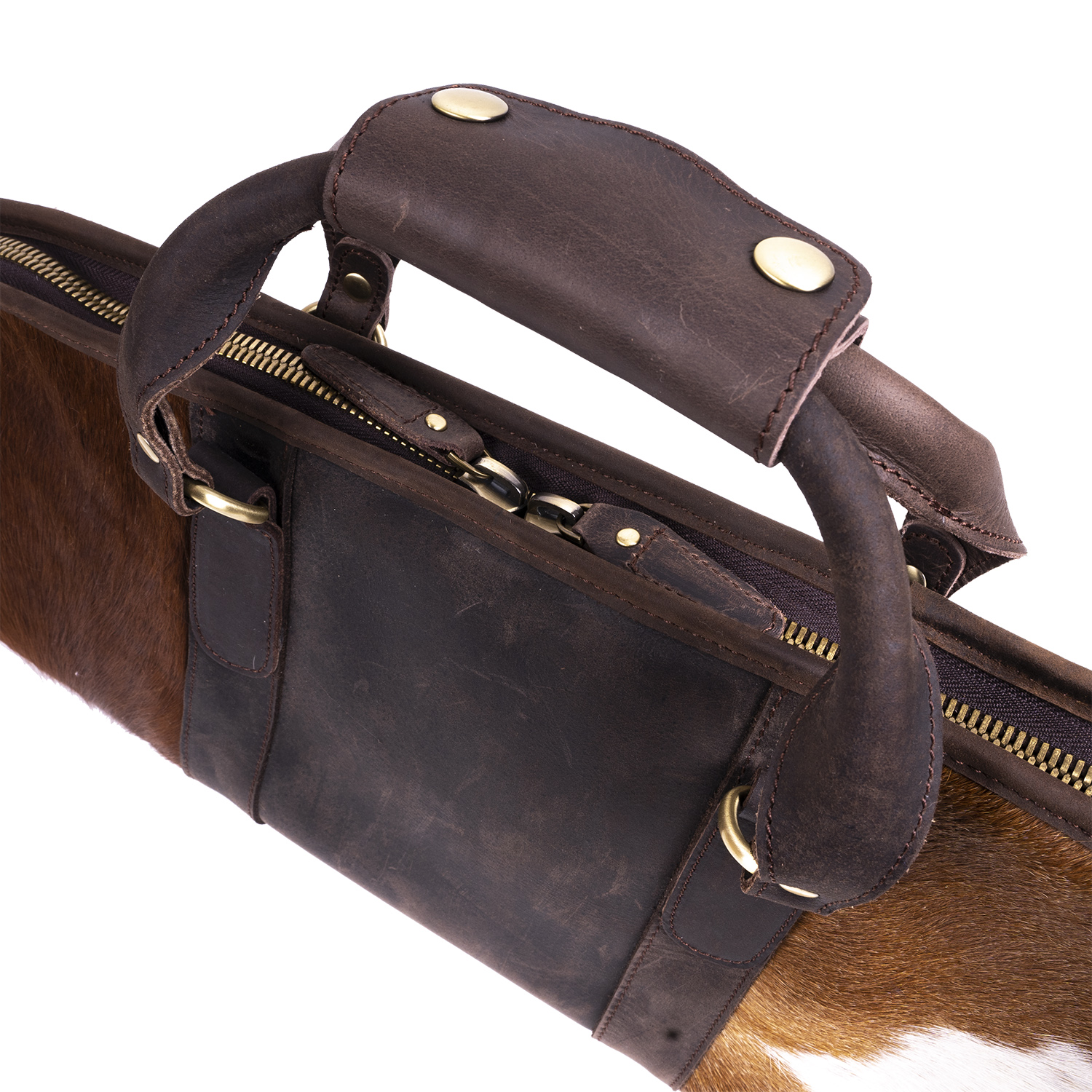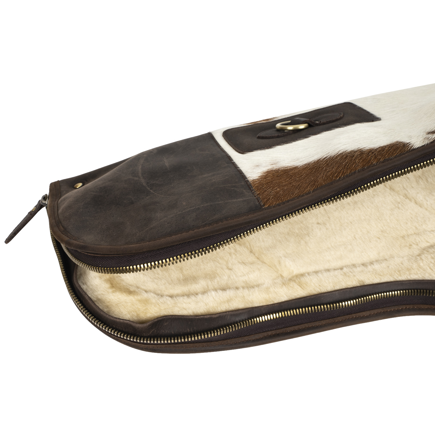 Be the envy of your hunting party with our impressive Hair on Hide Rifle Case. This handsome, high-end case is crafted with brown and white cowhide and top-grain leather; each one has a unique pattern, making it one-of-a-kind. Our Hair on Hide Case has a full length, heavy duty brass zipper and is lined with synthetic fur to provide protection for your rifle. The sturdy leather handles offer a sure, comfortable grip while transporting. Truly, this is the ideal case for the uncommon adventurer.