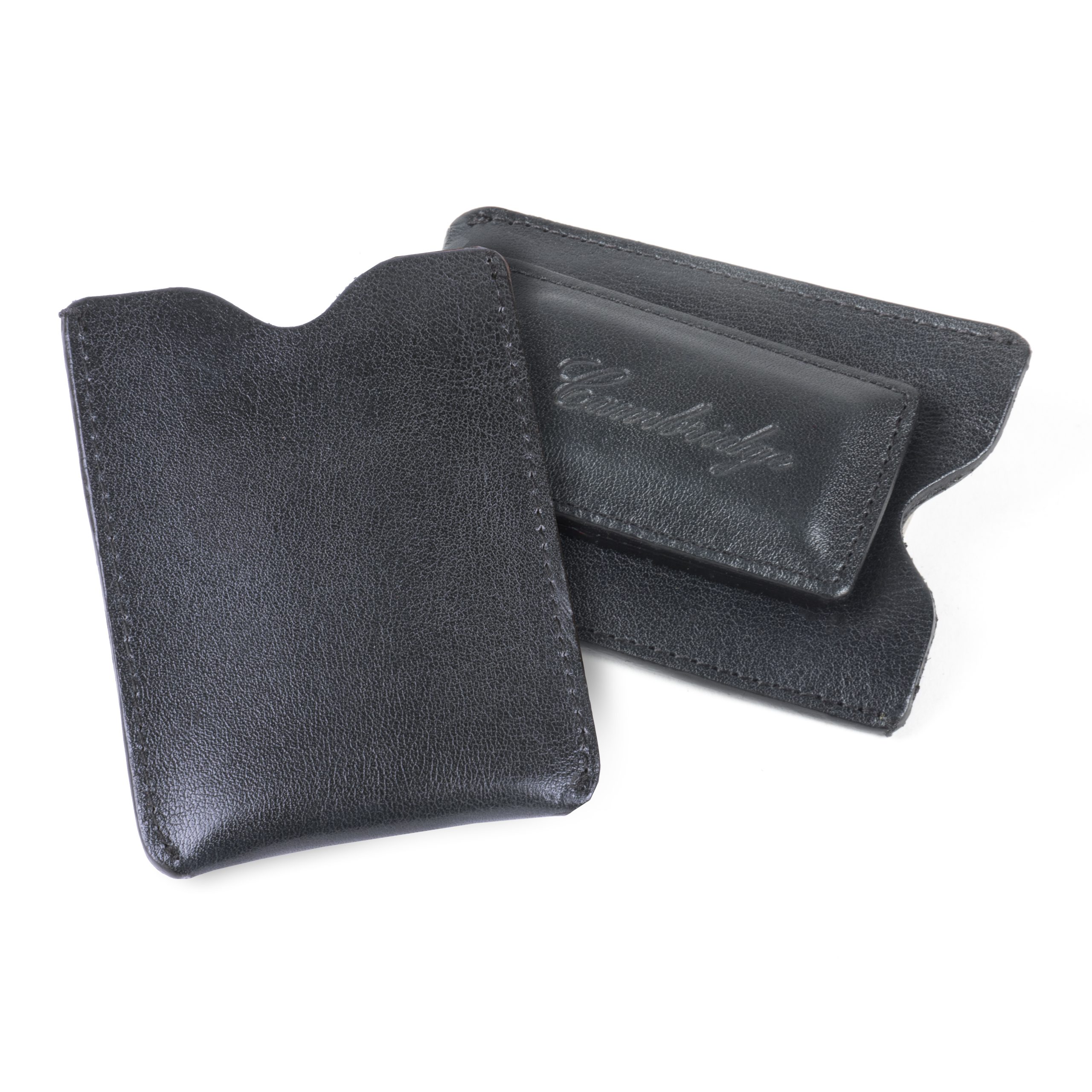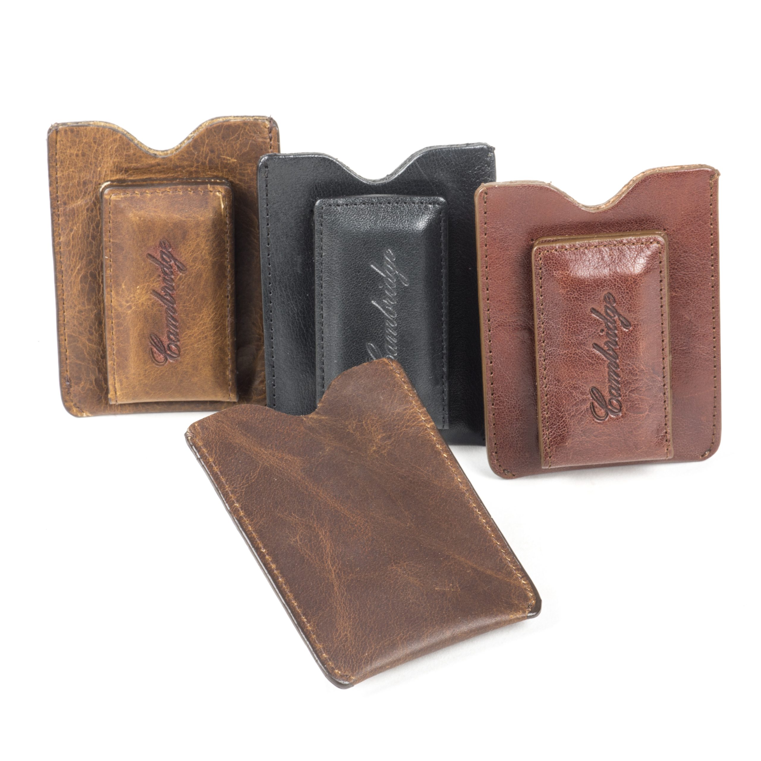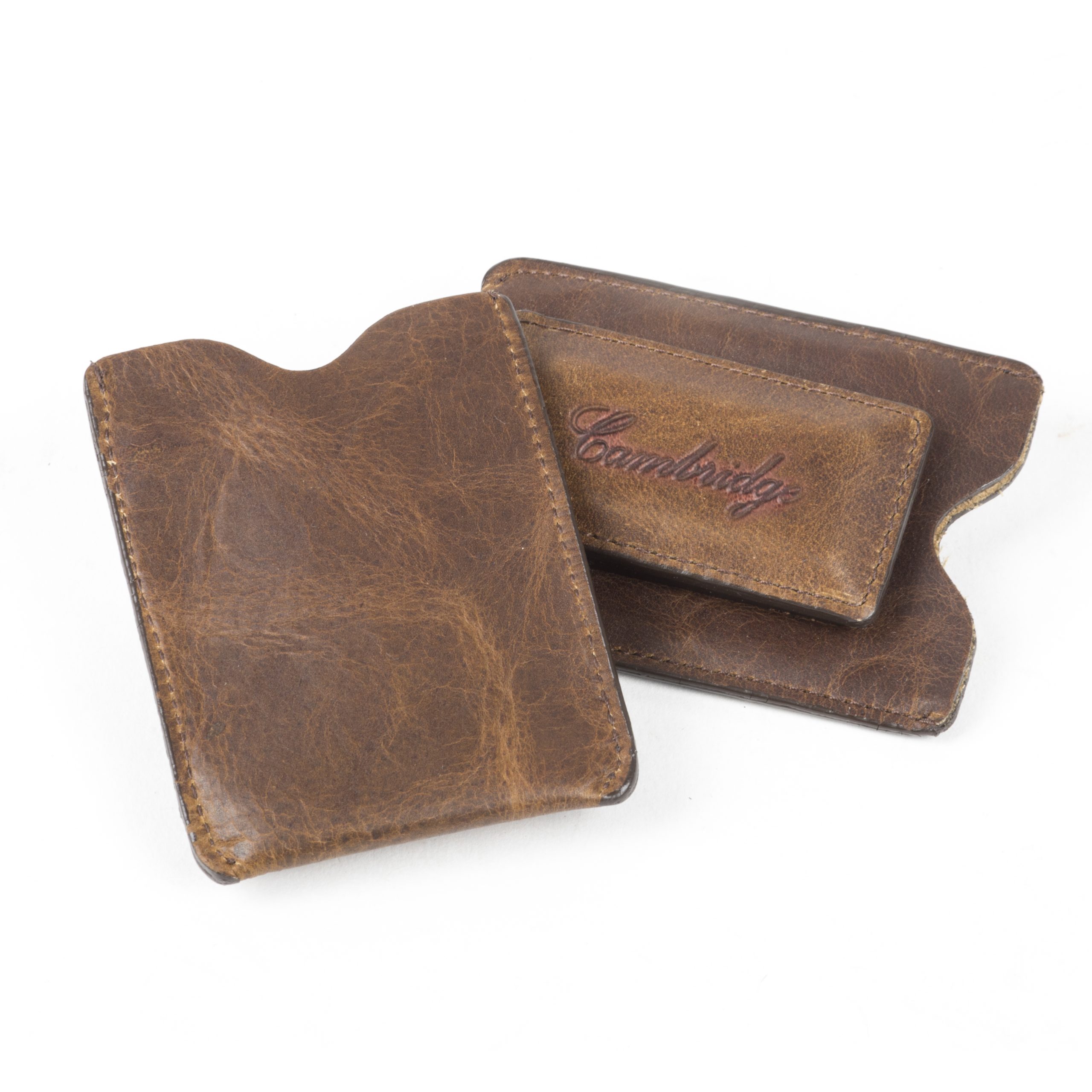 Never sit on your wallet again. This slim, leather credit card holder/money clip combination fits comfortably and securely in your front pocket, while your bills are held safely in place by the leather encased magnetized clip. Available in Black or Tumbled Cognac.